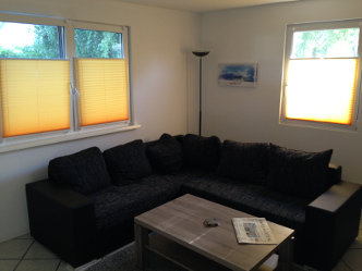 Wohnzimmer mit gemütlicher Sitzlandschaft, Sat-TV und kleiner Musikanlage.
